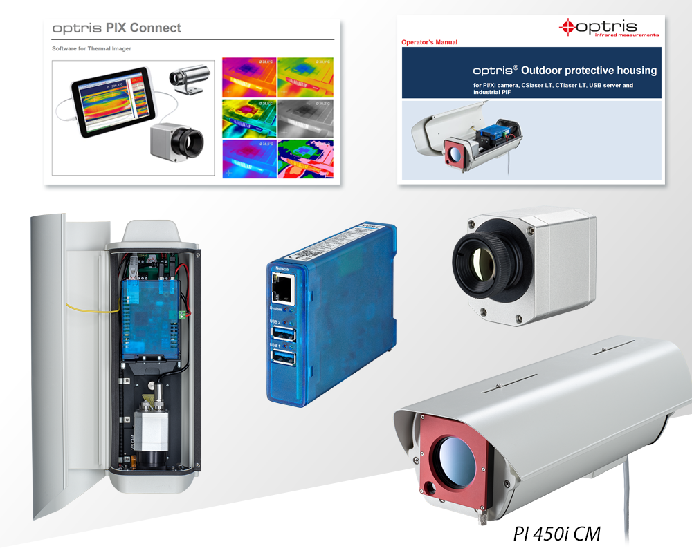 The PI 450i CM package meets the need for continuous monitoring in industrial outdoor environments. This comprehensive package integrates all essential components to effectively monitor equipment and fire hazards, providing early alarms when equipment overheats or when ignition temperatures indicate the onset of a fire. The package includes an infrared camera, an outdoor enclosure with a fan and heating element, a front window air purge, a high-definition video camera, and a USB Gigabit Server for long-distance video transmission.